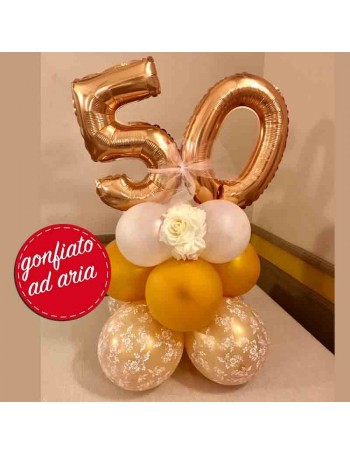 La composizione è creata da due palloncini numero 5 e 0 in mylar di colore Oro metallizzati da cm.35 l'uno e uniti con un fiocco di tulle, fissati su una base a 3 livelli con palloncini in lattice e rose bianche finte. Misura della composizione cm.60 circa. Adatta come decoro tavolo della torta o della confettata.